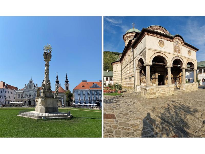Dreifaltigkeitssäule in Timișoara; Dreifaltigkeitskirche Kloster Cozia CCBYSA4.0 Vacant0; MIHAIL@wikimedia.commons